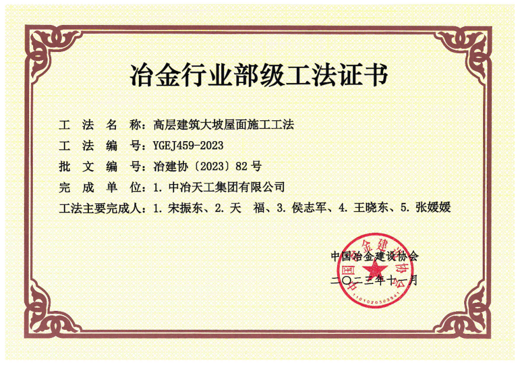 獲評工法《大型室外造浪池混凝土結構施工工法》借助公司滄州文化旅游城項目實施過程而總結提煉形成一種大型室外造浪池混凝土結構施工技術,解決了施工過程中異形結構模架支設困難、大體積混凝土水化熱釋放不完全、多層大底板內預埋給水管上浮、大底板弧形表面標高控制誤差過大等難題;工法《高層建筑大坡屋面施工工法》以滄州濱海童世界項目為依托,通過優化項目大坡屋面施工措施方案,設計便捷的施工操作平臺,不僅提高坡屋面的施工效率,降低成本,更有效保障施工人員的安全。