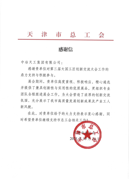 近日,工程技術總院收到天津市總工會致中冶天工感謝信。信中對中冶天工在第三屆大國工匠創新交流大會暨大國工匠論壇“五小”成果展示中的鼎力支持與積極參與給予充分肯定,對公司展品的“兼具創新性與實用性”以及專業團隊“全程高效保障”表示高度贊賞,展現了天津高質量發展創新成果及產業工人新風貌,為大會營造濃厚創新交流氛圍注入了關鍵力量。